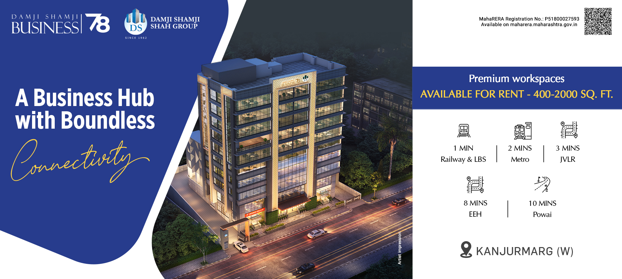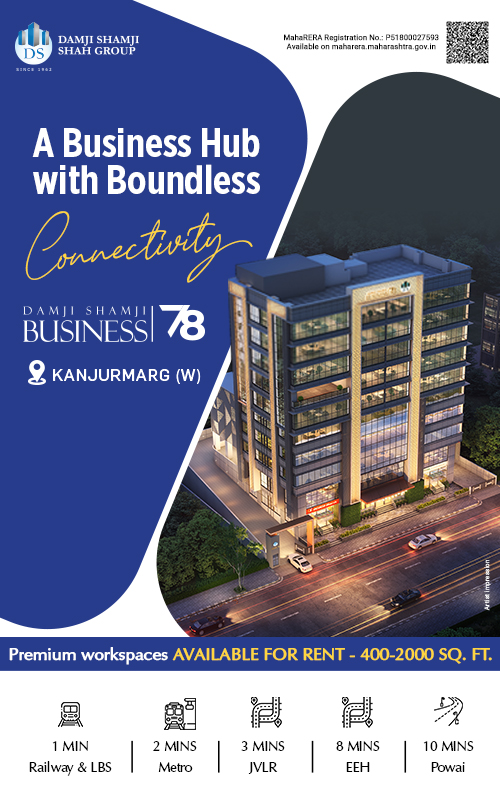 From ergonomically planned workspaces to intricately planned specifications that break away from traditional office norms, Damji Shamji Business 78 will mark a new era by transforming commercial investments and redefining corporate trends in modern times. Under the aegis of Damji Shamji Shah Group,Damji Shamji Business 78 is a benchmark corporate development, of Ground + 9 Upper Floors, a one-of-its-kind milestone project located at Kanjurmarg (W).